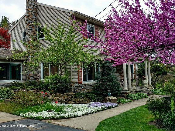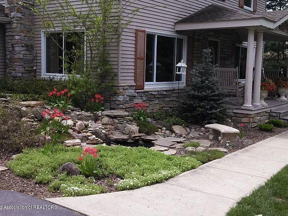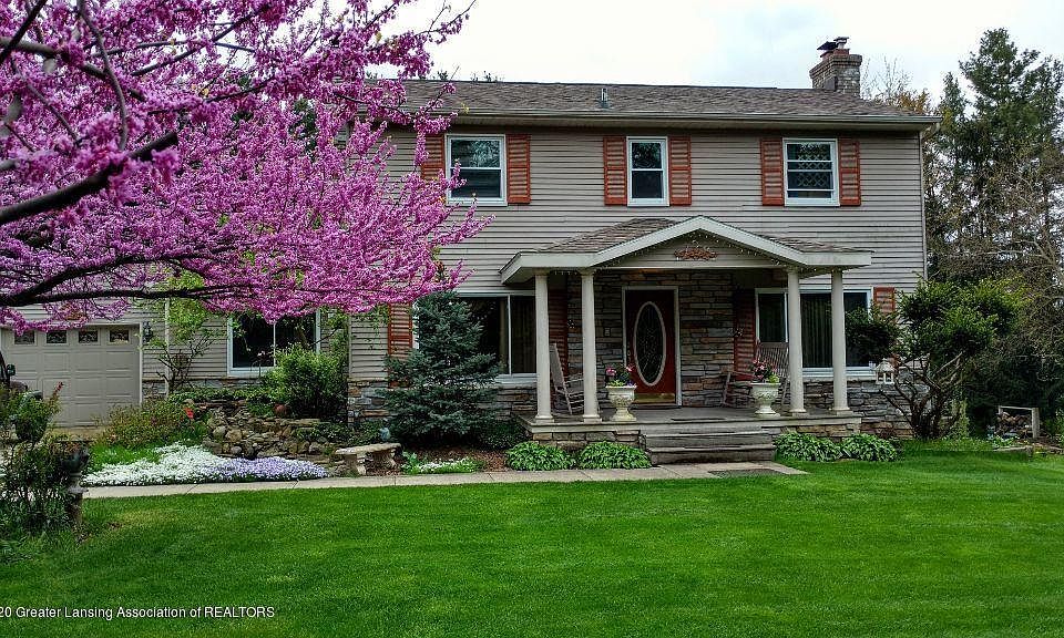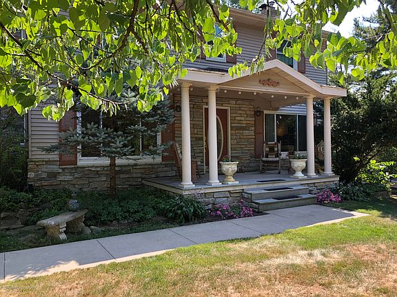The perfect place to vacation at home! This one is a little bit of country living right across the street from the city. Private and spacious. If you enjoy the outdoors you will love this property. 1-acre lot surrounded by trees, large patios, screened porch, and welcoming front entry with lots of parking space. Trex and stone outdoors for low maintenance. Mature landscaping produces beauty from spring to fall. Includes a Michigan floating splash pool; shallow and easy to care for with all the beauty of an inground pool. The fully updated house is spacious and comfortable. Upstairs has a master suite plus 3 bedrooms. Additional master suite downstairs with a separate outdoor entrance could be a mother-in-law quarters, guest room, or Airbnb rental. Large gas log fireplace, 2 whirlpool bathtubs, granite countertops, hardwood floors, new carpet. New roof and windows. High efficiency gas furnace and water heater. Salt water Pool