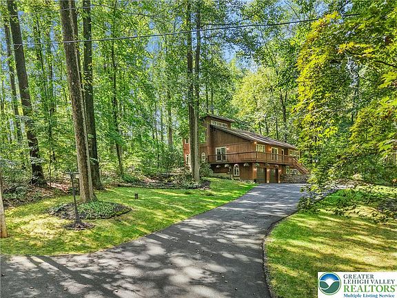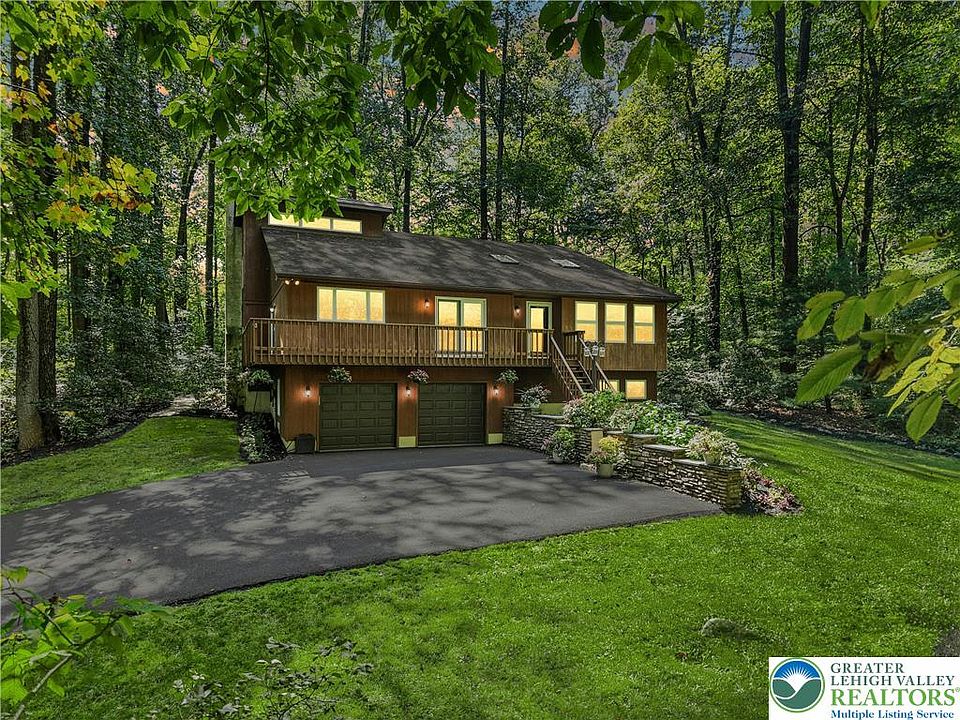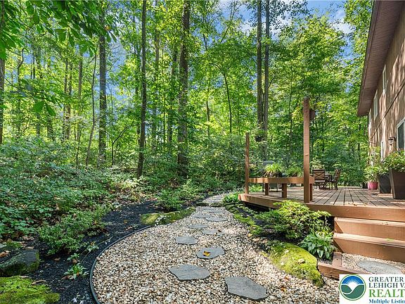 Escape the hustle & bustle as you wind down the long paved driveway to this captivating contemporary home, perfectly nestled on 2.4 private, wooded acres. Offering both tranquility & convenience, this one-of-a-kind property blends spacious living with a serene setting. Step inside to discover a versatile floor plan filled with natural light & generously sized rooms. The vaulted living room welcomes w/gleaming hardwood floors, 2 skylights, & an open, airy feel. Hardwood flrs continue in the elegant dining rm, providing space for gatherings & formal entertaining. The adjacent kitchen, featuring granite countertops, subway tile backsplash, & a cozy breakfast area with deck access. The family rm, anchored by a charming brick fireplace, opens directly onto the rear deck, perfect for relaxing with a view of the surrounding trees. A flexible bonus rm, also with deck access, offers endless possibilities: a game rm, home gym, office, or creative studio. The primary suite is a true retreat, with vaulted ceilings, a vanity area, & private ensuite bath. 2 additional brs, with updated flooring, share a hall bath. The wraparound deck invites you to unwind & take in the peaceful woodland views. Whether it’s morning coffee or evening gatherings, this space immerses you in nature while maintaining complete privacy. Move-in ready & ideally located, this home offers the best of both worlds - a private lifestyle with easy access to the PA Turnpike & Routes 663 & 309 for convenient commuting.