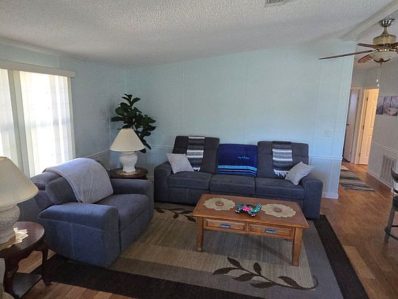 The interior features vaulted ceilings, ceiling fans, and an open floor plan in the living areas. No carpet , LVP throughout the home. For an added bonus with this home is the great location. Just around the corner from the Village pool and mail station and only a short cart ride to the Orange Blossom Pool, undoubtedly the best the Villages has to offer. Living room Sofa also has a built in recliner.