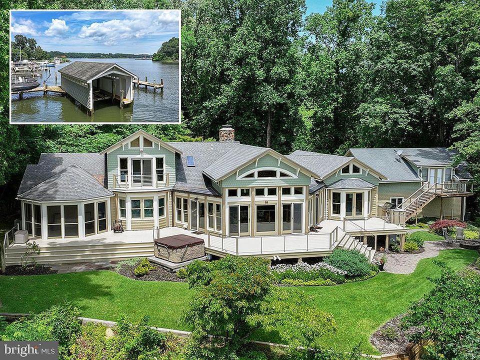 Ideally situated on the banks of Luce Creek with sweeping views down the Severn River, 1715 Porters Hill Road is a unique heritage property with over a century of history. Set on a 1.7 acre lot with 265 ft of waterfrontage, the property includes a large, hard-to-find boathouse that provides both charm and utility for all your waterfront adventures. The private pier has 7+ ft water depth and can accommodate a large vessel as well as an assortment of smaller boats. The tram makes access to the water effortless, and the entire property enjoys an exceptional privacy. Steeped in its storied past yet thoughtfully updated for modern living, this retreat captures the perfect balance of historic charm and casual elegance. The heart of the home is a sunlit great room with original log walls and quarried stone fireplace, a vaulted ceiling, and expansive windows which frame water views at every turn. An adjoining den, with separate entrance option, is a perfect place to relax. This could easily become another main level bedroom with ensuite bathroom. The kitchen is striking under its vaulted ceiling accented by exposed beams. The custom cabinetry, GE Monogram stainless steel appliances and generous island give the space so much functionality while maintaining the artisanal character. The kitchen opens to the dining area overlooking the water. The table is anchored by a craftsman-style light fixture, and the entire first and second floors have beautiful wood floors. Step outside and you’re embraced by nature: multiple porches and decks overlook lush, manicured grounds that lead down to the water’s edge. The main-level primary suite is a true sanctuary, designed for privacy and tranquility. The bedroom, with a vaulted ceiling, has a screened porch overlooking the water. Two expansive walk-in closets offer custom organization systems that would make a clothing connoisseur smile. The spa-like bathroom gets lots of natural light from the windows that frame the water, and the freestanding soaking tub is situated to enjoy this view. A dual-sink vanity, heated floors, generous walk-in shower with a built-in bench, and a spacious cosmetic area with dedicated seating make getting ready feel effortless and luxurious. A dedicated laundry area just off the hallway makes day-to-day living very easy. Part of the primary suite is a gracious office with gas fireplace and outdoor access. This is a totally flexible space: install a wall of bookshelves and you’d have a lovely library. Upstairs, there are two generously sized bedrooms. One has water views and a waterside balcony; the other overlooks the lush landscaping out front. There is a hall bathroom. A separate guest bedroom suite above the garage, complete with its own living area and luxe bathroom, is ideal for visiting friends and family who desire more privacy. The Historical Context: Originally built in the 1880s, this log house was one of three identical structures used as hunting lodges. It is the only one that remains. The construction of the log house is one of great craftmanship, including sizing each log to be approximately the same diameter as others. Lore has it that around the turn of the 20th century, the Naval academy wanted to acquire more land by the academy and traded this peninsula for land across from College Creek. The Naval Academy superintendent, Admiral David Porter, could be where the name Porter’s Hill derived from. In the 1920’s, the Whitehead family – three brothers known for running bootleg liquor to Baltimore and Washington during Prohibition — used the property as a place to entertain and stop on the way to Baltimore. In the 1940s, the brothers’ exploits caught up with them, and the State of Maryland confiscated the Porters Hill peninsula. Through a unique trade involving the Jones family’s gravel pit (now the site of the 895 Tunnel), this private waterfront enclave found its next chapter.