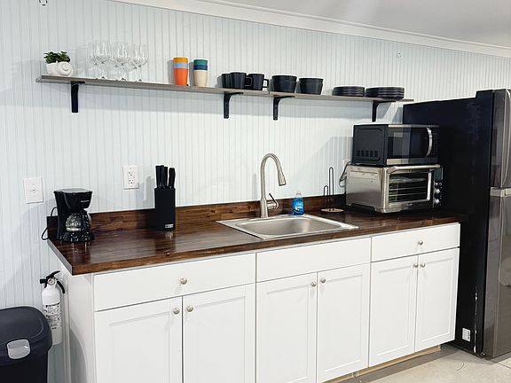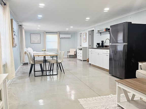 Welcome to this beautifully furnished coastal studio located in Kill Devil Hills available for a 6 month lease with all utilities included. This spacious, open-concept unit offers modern beach-house style with polished concrete floors, soft coastal tones, and abundant natural light. Enjoy a comfortable king-size bed, cozy living area with sofa and smart TV, and a dedicated dining space perfect for meals or remote work. The kitchenette includes a full-size refrigerator, microwave, toaster oven, coffee maker, and open shelving with ample counter space, ideal for extended stays. High-speed Wi-Fi, heating and cooling, and updated lighting throughout provide year-round comfort.