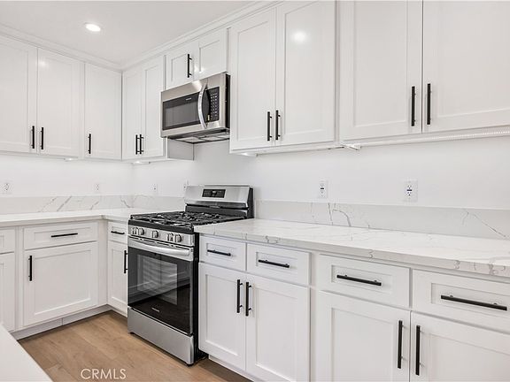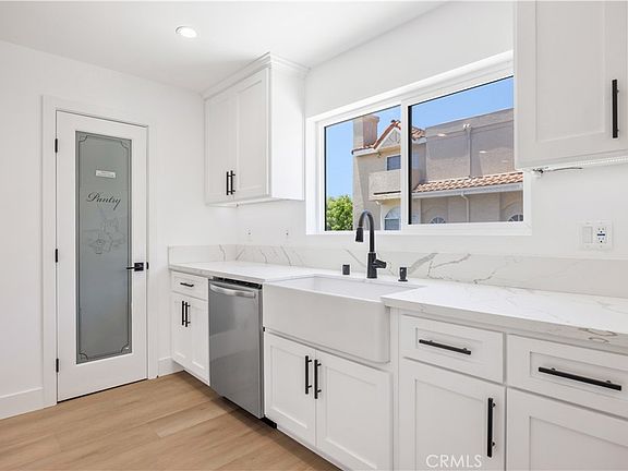The chef-inspired kitchen boasts a large quartz island, stainless steel appliance package, farmhouse sink, and walk-in pantry—perfect for hosting gatherings. The living room opens to a private balcony, while the ground-level patio offers additional outdoor space. The luxurious primary suite includes a spa-like bathroom with a walk-in shower, soaking tub, dual vanities with quartz counters, and a generous walk-in closet.