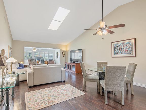 Step through the stylish, upgraded entry door into a light-filled interior that seamlessly blends comfort and elegance. Soaring vaulted ceilings, luxury wood-like flooring, and double-pane windows with classic plantation shutters create an inviting atmosphere, while skylights in the living room and kitchen bathe the space in natural light. Climate comfort is ensured year-round with Nest-controlled central air and heating.