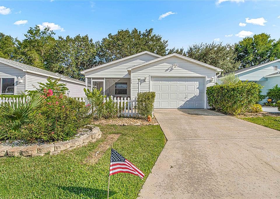 Welcoming you to The Villages is this Beautiful COLONY PATIO VILLA in the well established village of De La Vista West! Centrally located half way between both Spanish Springs and Lake Sumter Landing, this home will blow your mind with all it has to offer… Well maintained 2/2 open floor plan FEATURING A BRAND NEW ROOF, INTERIOR PAINT (WALLS, DOORS, CEILING, GARAGE), CARPET AND WATER HEATER makes this home the perfect fit for you! As you approach the screened in front lanai, you are greeted with a luxurious space to enjoy your morning coffee. Vinyl plank flooring throughout the main living space of the home. Kitchen has a breakfast bar with plenty of space for additional seating, spacious cabinets with an abundant amount of storage, and a solar tube to keep electricity cost at a minimum. The king-size primary suite offers BRAND NEW carpet, a WALK-IN CLOSET and a private bathroom with a WALK-IN SHOWER. A private patio off of the living room, great for entertaining and grilling. The landscaping offers great curb appeal and privacy. This 1 car plus Golf-cart garage has pull down attic stairs. Schedule a showing today to see it for yourself, as this home will not last long! Again, ALL NEW AUGUST OF 2023 PAINT, SEPTEMBER OF 2023 ROOF, AUGUST OF 2023 WATER HEATER, AUGUST OF 2023 CARPET IN THE BEDROOMS.