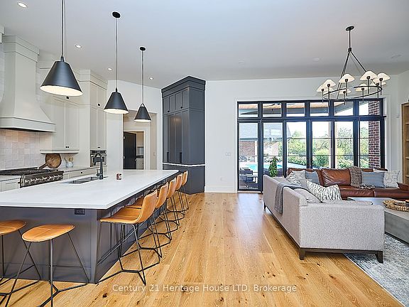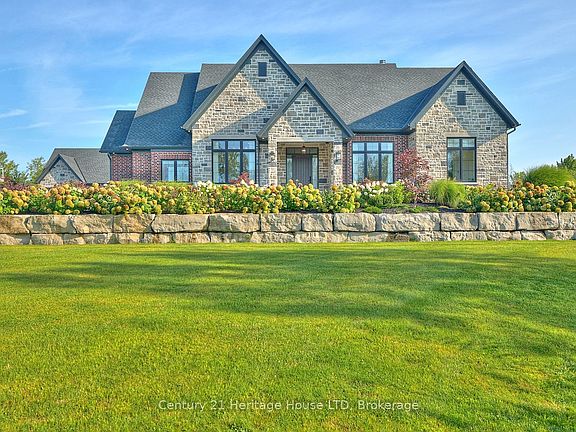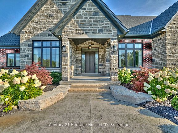 Experience the perfect blend of country charm and in-town convenience with this exceptional brick bungalow on 1.7 acres of professionally landscaped grounds.A stone walkway, lush gardens, and a welcoming front porch create outstanding curb appeal. Inside, the open-concept layout is designed for modern living. The chefs kitchen boasts quartz countertops, a large island with seating, built-in appliances, and ample cabinetry. A bright dining area flows into the spacious great room featuring a cozy gas fireplace with a custom cast mantle and patio doors leading to a covered rear patio and resort like backyard.The primary suite offers a walk-in closet and spa-like 5-piece ensuite with in-floor heating, quartz vanity, soaker tub, and separate shower. Two additional bedrooms with walk-in closets share a stylish 4-piece bath. Hardwood flooring runs throughout, complemented by a powder room, main-floor laundry, mudroom with garage access, and an unfinished basement ready for your vision.Outdoors, enjoy a detached 3-car garage with roughed-in in-floor heating and loft space, a fenced yard with in-ground pool, and an entertainment area with outdoor fireplace and entertaining bar perfect for gatherings.Located within walking distance to Lake Erie and the Friendship Trail, and minutes from schools, beaches, arenas, community centre, highways, and the Peace Bridge, this property delivers lifestyle, comfort, and convenience.