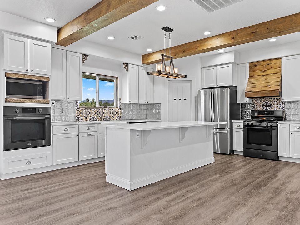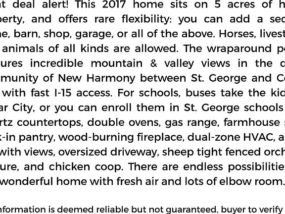 Great deal alert! This 2017 home sits on 5 acres of horse property, and offers rare flexibility: you can add a second home, barn, shop, garage, or all of the above. Horses, livestock, and animals of all kinds are allowed. The wraparound porch captures incredible mountain & valley views in the quiet community of New Harmony between St. George and Cedar City with fast I-15 access. For schools, buses take the kids to Cedar City, or you can enroll them in St. George schools too. Quartz countertops, double ovens, gas range, farmhouse sink, walk-in pantry, wood-burning fireplace, dual-zone HVAC, and a loft with views, oversized driveway, sheep tight fenced orchard, pasture, and chicken coop. There are endless possibilities on this wonderful home with fresh air and lots of elbow room.
