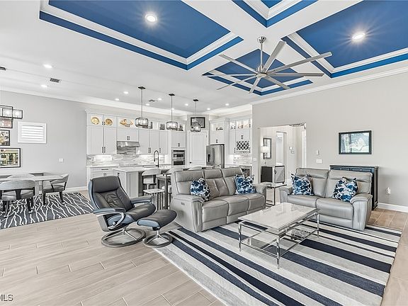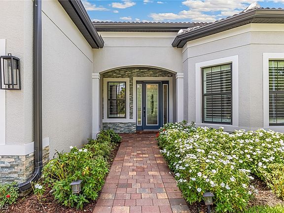 Welcome to 17160 Easy Stream Ct., an absolutely stunning home with Model Home-Like finishes and furnishings. MOVE-IN READY!! Spanning 2488 sq. ft. with soaring ceilings, 3 bedrooms, 3 full baths, den, 3 car garage, custom front door and panoramic lake and golf course views. DESIRABLE SOUTHERN EXPOSURE! This meticulously maintained home, with its professionally designed interior, has all the bells and whistles already added and is being offered "TURNKEY FURNISHED". You'll feel the sophisticated flair with modern comfort throughout. The gathering room offers a custom stone wall with a fireplace, coffered ceilings, and zero-corner sliders which gives the open floor plan an amazing light, airy atmosphere for today's discerning homeowner. Situated on a peaceful, quiet Cul de sac lot, privacy abounds with a front preserve view and the Davis Love, III Championship Golf Course as a backdrop to the wide lake views at the rear of the home. Enjoy peace of mind with the whole house portable generator, impact windows and doors, security cameras, hurricane rated electric roll-down screen on lanai and electric roll-down super screen on the front entry. Custom stonework, lush landscaping, and upgraded lighting adds curb appeal to the exterior. The built-in kitchen upgrade offers stainless steel KitchenAid appliances, white cabinetry with upper lighted cabinets, rollouts, dry bar with wine rack and beverage refrigerator, quartz countertops and a large island with seating. The cafe dining area has great lake views and opens to the covered lanai/pool deck for easy entertaining. The master suite is a private oasis with a raised ceiling, designer finishes, lake views, pool access and the master bath is remarkable with custom finishes. Guest bedrooms are spacious, and guest baths are impressive. Upgraded front door with sidelights, plantation shutters, crown molding, tile flooring, and custom color schemes throughout adds character to this well-maintained home. The pool package includes solar heating, picture-window super screening, salt-water system, Robotic pool cleaner, paver deck, safety fence and incredible lakefront views! GOLF CART IS INCLUDED. River Hall Country Club offers bundled golf, 18-Hole Championship Course, putting greens, practice range, amenities including 2 restaurants, heated lakeside pool and Bunker Bar, Town Hall Center with tennis, pickleball, fitness center, game room, playground, resort pool and more. Just minutes to I75, airport, hospitals, dining, shopping and the Downtown River District, which offers art and music festivals, riverfront parks and more. Make an appointment now to see this exceptional home!
