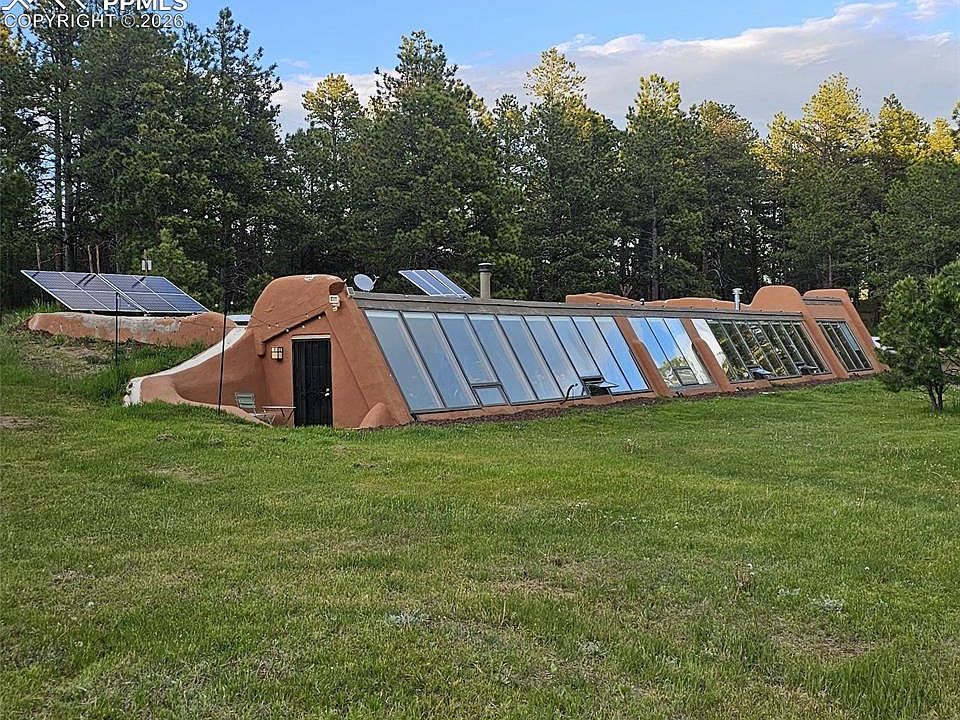An exceptional, rare Earthship retreat awaits in the heart of Black Forest. Nestled among trees this off-grid, solar-passive home on 5 private, peaceful acres offers a self-sustaining lifestyle without sacrificing comfort or modern convenience. With over 2,900 sq ft on a single level, the home is thoughtfully designed to maintain a comfortable climate year around while being completely independent from public utilities. A dramatic 100-foot wall of windows anchors the front of the home, flooding the expansive interior with natural light. An indoor pond and wall of built-in planters complete with drip irrigation bring nature seamlessly indoors. The spacious kitchen is a standout, featuring abundant cabinetry, a generous walk-in pantry, slate backsplash, extensive counter space, brand new propane powered refrigerator and large dining space. Energy efficient with fully owned new solar system, an automatic propane generator, on-demand tankless water heater, and 2 heating options; cozy gas-burning stove and a brand new pellet stove. Utility costs remain impressively low. High-speed fiber optic internet, offering lightning-fast connectivity even in this serene, rural setting. The bathroom is both functional and artistic; large windows, a deep tub, double vanity, a stained-glass door, and a wall of embedded glass bottles that cast beautiful, colorful light in the space. The great room invites relaxation with large seating area, abundant sunlight, and sweeping views of the property. The primary suite is a retreat with walk-out access to the side patio, planters, a comfortable sitting area, and a walk-in closet. A flexible guest room offers a cozy recessed bed and a built-in planter wall that provides privacy and character. Additional highlights include an attached 2-car garage, a domestic well with a 500-gallon storage cistern and dedicated solar panels, an outbuilding, and land suitable for horses, animals, or RVs. With no HOA, the property offers freedom and versatility.