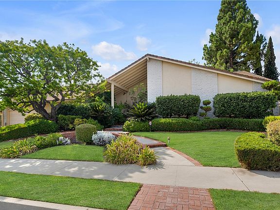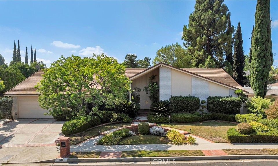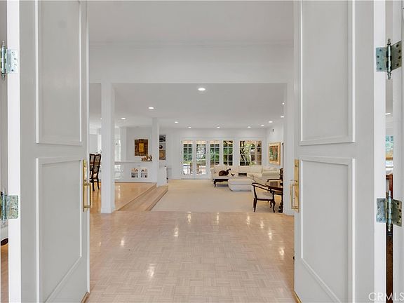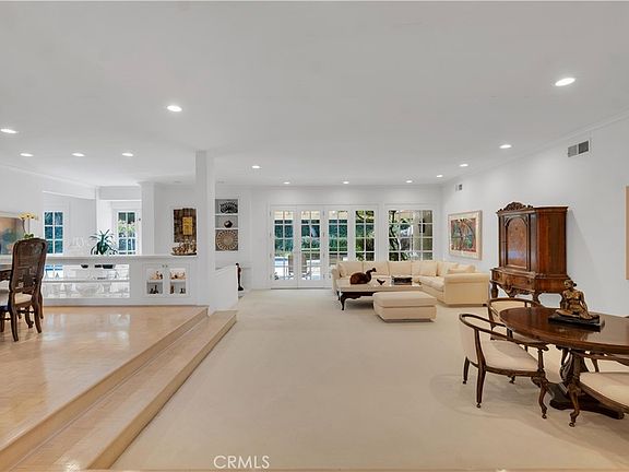 Wonderful, mid-century, ranch-style, 5 bed, 3.5 bath, over 3700 sqft home set on an expansive 16,228 sqft lot in quiet residential neighborhood in Northridge blends timeless architecture with spacious comfort. Great curb appeal with A-frame roofline, white brick panels, wide drive with brick ribbons, circular walkway, and manicured green lawn framed by hedges and shade tree. Elegant double doors open into a formal entry and open, inviting home, with tasteful and elegant touches like parquet floors, crown molding, high ceilings, and recessed lighting throughout. Formal sunken living room is a bright and airy space, perfect for entertaining and gatherings with French doors to the patio, and open flow to the dining area and sunken conversation pit. Dining room showcases a wide archway, lighted cabinetry, and passthrough to the conversation pit, which features a marble-surround fireplace, wet bar, and built-in shelves for display. Expansive, informal family room offers built-in shelving, French doors to the yard, and a pass-through to the bright eat-in kitchen. Kitchen boasts white cabinetry, white appliances, granite counters and backsplash, and a cozy breakfast nook. A powder bath and dedicated laundry room add convenience, while a nearby private bedroom with adjacent ¾ bath is perfect for guests or a home office. Down the hall, the primary suite impresses with double-door entry, mirrored walk-in closet with custom built-ins, generous space with room for a sitting area and French doors to the backyard. The en-suite, spa-style bath offers heated tile floors, marble counters, beveled mirrors, plantation shutters, jetted soaking tub, and separate shower. Three additional, sizable bedrooms with large windows, including one arranged as a study with built-in bookshelves and desk that could be converted back, share a full hall bath with dual-sink marble vanity and access to the side yard. Additional features include dual pane windows, dual zone HVAC, dual water heaters, and an attached 2-car garage with overhead storage and direct access. The spacious backyard is a true retreat with a large pergola-covered deck, in-ground pool with brick coping, sprawling lawn, and mature landscaping. Well situated in Granada Hills Charter district, near shopping, dining, recreation, and entertainment, CSUN, local parks, and major transportation arteries. This property offers both immediate comfort and a canvas for personalization in prime Northridge setting. Don’t miss out!