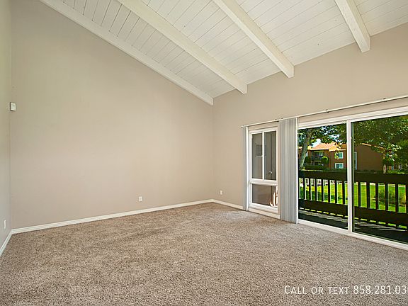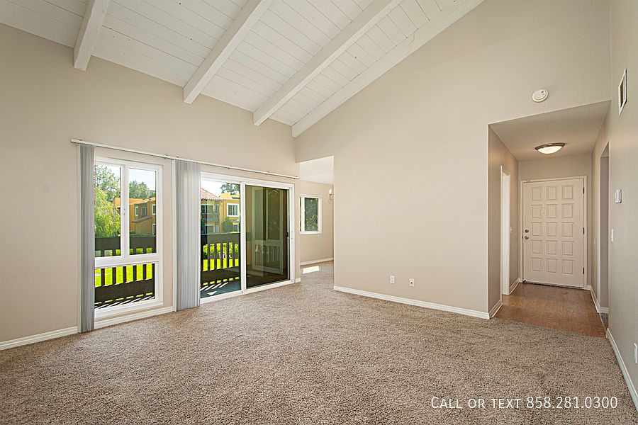 A great 2 bedroom and 2 bath, bright, light, and airy upper-level condo. 950 sq/ft. Located in the Waterbridge community in Rancho Bernardo. High ceiling in the living room. Granite countertop in kitchen and bathrooms. Includes newer Whirlpool appliances - washer, dryer, range, dishwasher and refrigerator. In-unit laundry. Balcony overlooking a beautifully maintained community landscape. Park-like view from living room & kitchen. Newer custom paint, carpeting, and window coverings. Storage cabinets. Comes with 2 gated, assigned parking spaces. Community pool and hot tub access.