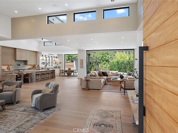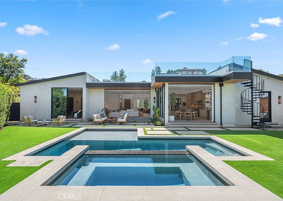 Perched high above the Valley in the hills of Encino, resides this stunning newly reimagined estate that offers dramatic city light views. Situated on a gated quarter-acre lot, this home features a contemporary exterior that gives way to a warm, inviting interior filled with rich woods, natural stone and high-end fixtures. The bright and airy open-concept floor plan is anchored by a gourmet chef’s kitchen equipped with top-of-the-line Thermador smart appliances and a massive waterfall island with a built-in table. Both the spacious living room and formal dining room boast oversized sliding glass doors that disappear into the wall, seamlessly extending your living space outside so you can take full advantage of indoor-outdoor living. A true entertainer’s paradise, the private backyard retreat offers a resort style pool with a large spa and baja shelf, along with a poolside cabana and expansive 874 sf rooftop patio – the perfect place to start your day as you watch the sun rise over the Valley. Inside, you’ll find four generously sized ensuite bedrooms, including a luxe primary suite that features dual walk-in closets and a sumptuous bathroom, complete with an oversized rainfall shower, soaking tub and double vanity. Additional highlights include a home office, dedicated laundry room, a smart home system with built-in speakers, high ceilings throughout and a two-car garage. Located south of the Boulevard within the top-rated Lanai School District, this exceptional property enjoys easy access to everything the Valley and Westside have to offer.