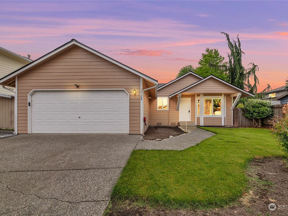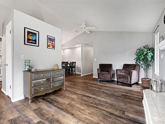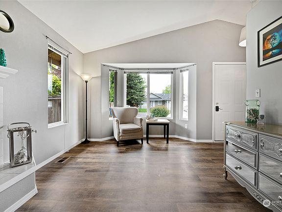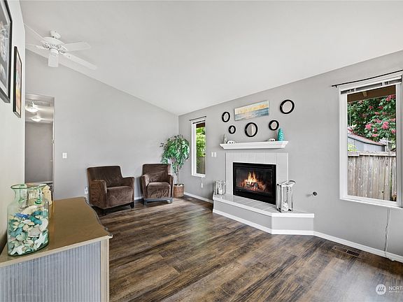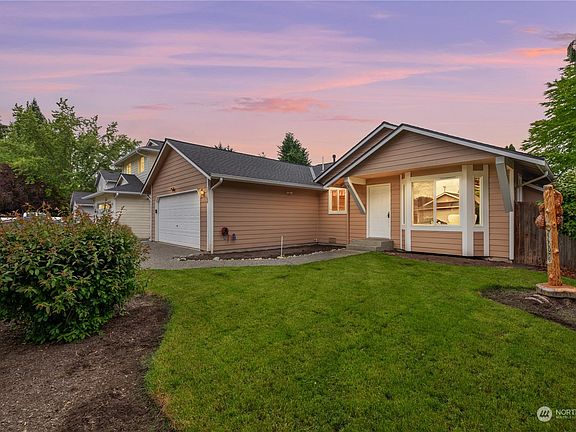 Welcome to this meticulously maintained rambler, offering spacious and inviting living spaces sure to delight. Step inside to discover a generously sized living room featuring vaulted ceilings and a delightful bay window, flooding the area with natural light and complemented by a warm gas fireplace. The kitchen seamlessly flows into an expansive dining area and cozy family room, perfect for daily living and entertaining. Retreat to the primary bedroom with its own attached en suite bath, alongside two additional bedrooms and another full bath. Outside, the fully fenced backyard boasts easy upkeep and a sizable concrete patio, ideal for outdoor enjoyment. Just minutes to shopping, dining, parks, and quick access to SR 522.