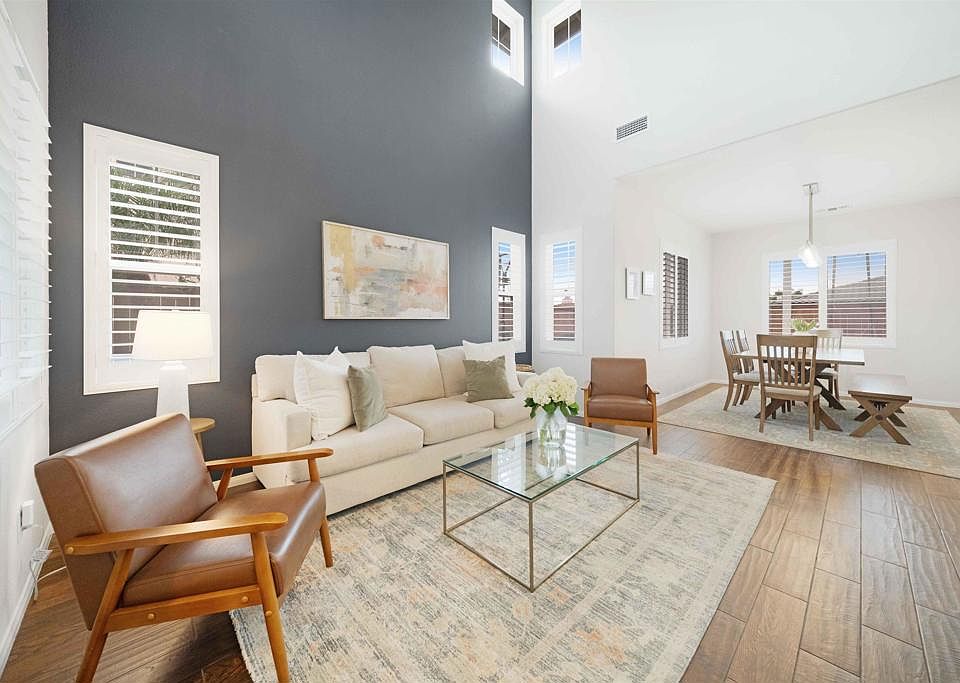 Stunning VA & FHA welcome! Welcome to 1717 Bramblewood Street in Otay Ranch Lomas Verdes a beautifully maintained 3-bed, 2.5-bath home with soaring vaulted ceilings, custom plantation shutters, wood-look tile flooring, and an updated kitchen with white cabinetry and stainless steel appliances. The open layout flows into a cozy family room with fireplace and direct access to the private backyard featuring little to no maintenance turf landscaping, newer concrete and complete new fence. Primary sunset views for the win ensuite bathroom with large walk-in closet. Upstairs closet washer and dryer for added convenience. Best yet? HOA under $100! Walking distance to McMillin Elementary, Casa Nori, and multlple parks. 2 car garage with ample storage. recent other updates: ice cold A/C, 2019 water heater replaces, new pressure regulator, & newer paint to name a few. Perfectly located within walking distance to Corky McMillin Elementary and neighborhood parks. HOA fees are under $100/month, and Mello-Roos are almost fully expired. Enjoy top-rated schools, convenient shopping, dining, and easy freeway access. A rare blend of comfort, location, and value.