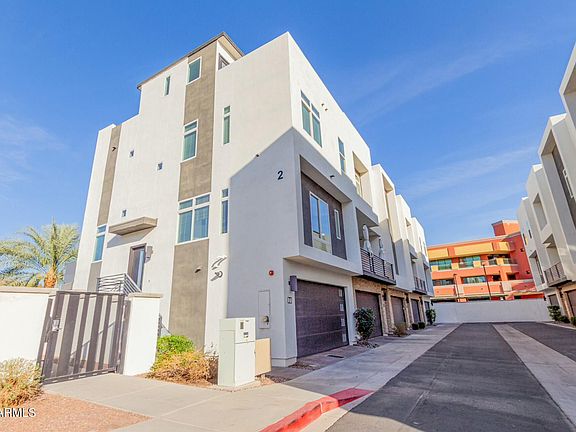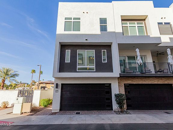 Exquisite tri-level corner townhouse with rooftop deck boasting 360° views of Piestewa Peak and North Phoenix. This 3-bed, 2.5-bath residence offers three levels of outdoor living, a 2-car garage, and a light-filled open floor plan. The gourmet kitchen features a spacious island, upgraded appliances, and panoramic glass sliding doors to balcony. The primary suite impresses with a walk-in closet and spa-like en-suite. A bonus room on ground level offers flexible space for office, den or guests. The rooftop deck is perfect for elegant entertaining or sunset yoga. Pointe 16 boasts gated entry, a community pool, and prime access to top dining, trails, and Biltmore's finest shopping. Seller upgrades: wall-mounted tv in main living area as well as new carpet, paint. Must see!