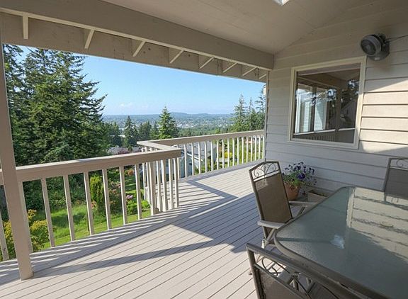 Unobstructed views over Bellingham & the Canadian coastal mountain range! This spectacular 4 bedroom home features a large custom kitchen with tile features & plenty of cabinet space, dining areas, wet bar, living spaces upstairs and down, both with their own cozy fireplaces, hardwood flooring, plenty of windows throughout the home holding your scenic views, vaulted ceilings, a lovely sun room, and Master with ensuite private built-in hot tub & amazing views! 2 sprawling covered back decks. All of this sits on a large landscaped lot!