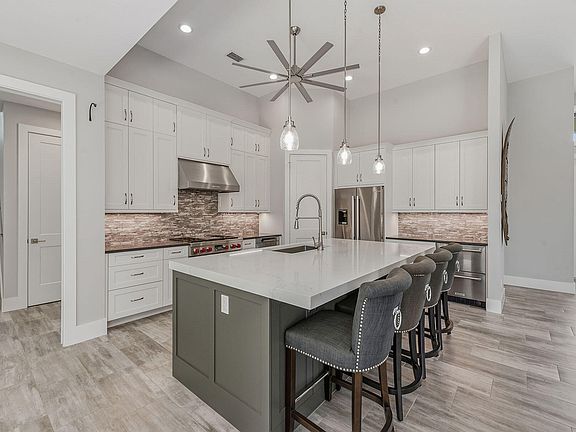 Custom built in 2024 by FCI, this stunning two-story residence offers the rare opportunity to enjoy a nearly new, meticulously crafted home on Marco Island with premium upgrades throughout, including a Wolf gas cooktop, whole-home generator, and an exceptional heated pool with spa designed for effortless indoor-outdoor living. From the moment you arrive, the home's fresh, modern construction and thoughtful design create an immediate sense of luxury, comfort, and quality. Impact-resistant doors and windows, custom finishes, and a fully fenced backyard elevate this coastal retreat into a true move-in-ready haven. Inside, the open layout features recessed lighting, modern ceiling fans, tile flooring, and custom window treatments that enhance the home's clean, contemporary aesthetic. The gourmet kitchen is beautifully appointed with white cabinetry, under-cabinet lighting, quartz countertops with tile backsplash, and a generous four-seater island that anchors the space. Premium appliances include Wolf 4-burner gas cooktop with matching hood, under-counter microwave, and refrigerated drawers. A walk-in pantry offers excellent storage, while the adjacent dining area features lanai access, creating seamless flow for entertaining. The living room overlooks the pool and spa and is highlighted by a tray ceiling and a 3-panel glass slider that expands the living space outdoors. The luxurious primary suite offers a private retreat with a tray ceiling, French doors to the lanai, and two walk-in closets with wood shelving. The spa-inspired primary bath features a quartz dual-sink vanity, a separate soaking tub, and an oversized walk-in shower tiled floor to ceiling with multiple shower heads, a bench, and frameless glass enclosure. Two guest bedrooms on the main level share a beautifully finished adjacent bath with a walk-in shower that also serves as a convenient pool bath. Upstairs, the expansive loft provides exceptional flexibility with its own kitchenette featuring quartz counters and refrigerator drawers, a private screened lanai, a walk-in closet, and an en-suite bath with a walk-in shower. A dedicated den with French-door entry is ideal for a home office or study, while the well-designed powder bath sits conveniently off the hallway. Outdoor living is at the heart of this home, showcased by a panoramic-screen lanai, Travertine deck, and a stunning heated pool with spa, sun shelf, and water feature. The covered outdoor living area includes a full outdoor kitchen with grill, sink, and granite counters, perfect for year-round entertaining. The fully fenced backyard adds privacy and peace of mind. Additional features include quartz counters in laundry room and an oversized two-car garage with epoxy flooring.