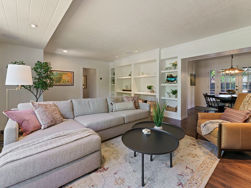 Step inside through the front door to a cozy TV room featuring a smart TV, surround sound speakers, a comfortable couch, a reading chair, and custom cabinetry.