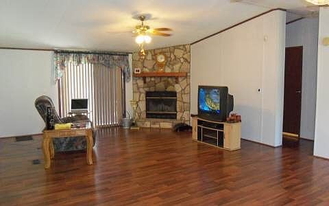 Country living in nice well kept DWMH on 1.5 acres. Home has new wood laminate flooring, new interior paint, wood burning fireplace, combined kitchen/breakfast area and a 20 X 12 deck on the rear. There is a 20 X 20 workshop/storage, a 7 X 11 storage building, a pump house and a chicken coop. Nice big front yard. Zoned for horses, but no facilities for horses.