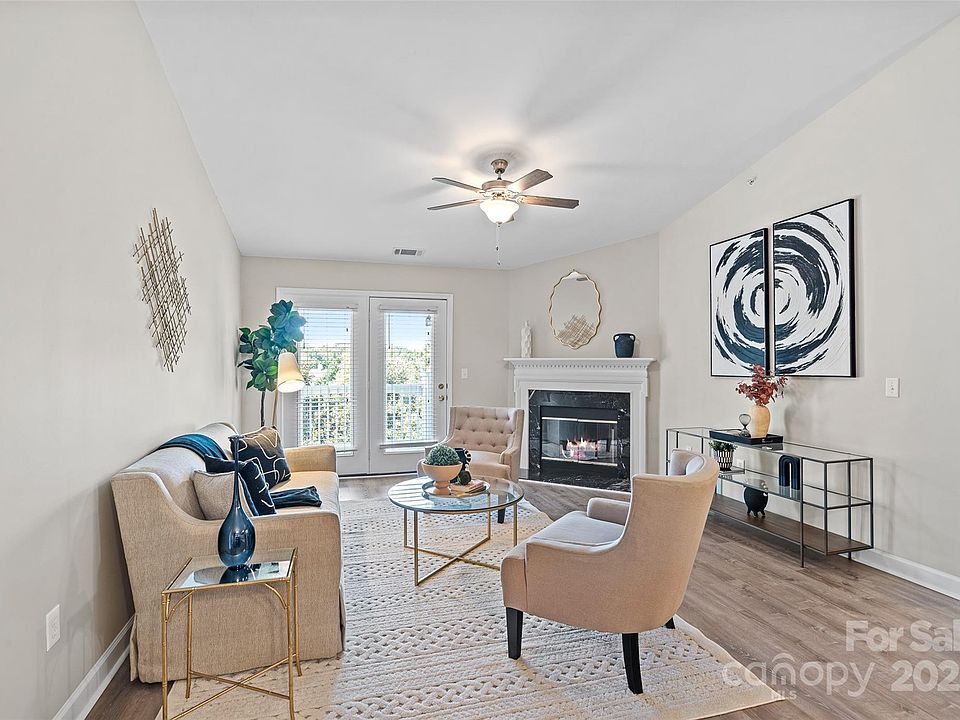 The crown jewel of Copper Ridge! This rare end-unit penthouse condo is fully move in ready with vaulted ceilings and abundant natural light. The spacious living room, highlighted by a corner fireplace, flows seamlessly into the dining area and opens directly to the covered balcony for seamless indoor-outdoor living with beautiful views. Fresh paint, new fixtures and LVP flooring extend throughout the home, complementing the kitchen with granite countertops, tiled backsplash, and ample cabinetry. The primary suite offers a large walk-in closet and upgraded bath, while a true split bedroom layout places the secondary bedroom alongside an additional updated full bath. Residents enjoy low maintenance living with resort-style amenities including a clubhouse, fitness center, sparkling pool, tennis courts, and picnic areas. Perfectly located near everything Ballantyne has to offer from award winning dining and shopping to entertainment at Ballantyne Bowl, all with convenient access to 485 for effortless commuting.