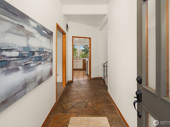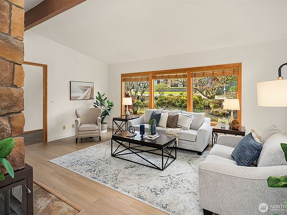 This classic Pacific Northwest home, set on a quiet street in Bellevue’s cherished Woodridge neighborhood, welcomes you with slate tile and vaulted ceilings. An exposed beam, wood accents, and a floor-to-ceiling stone gas fireplace warm the living room. Enjoy views of the incredible backyard with established shrubs, paver patios, all-weather decks, garden beds, and a trellis from the kitchen and dining room. The primary suite is clad in hardwoods with French doors to the upper deck. The lower level has a spacious family room. Recent updates include fresh paint inside and out, new LVP flooring, and carpet. The home backs to Woodridge Open Space. Woodridge Elementary is nearby. Located just moments to downtown Bellevue or Factoria.