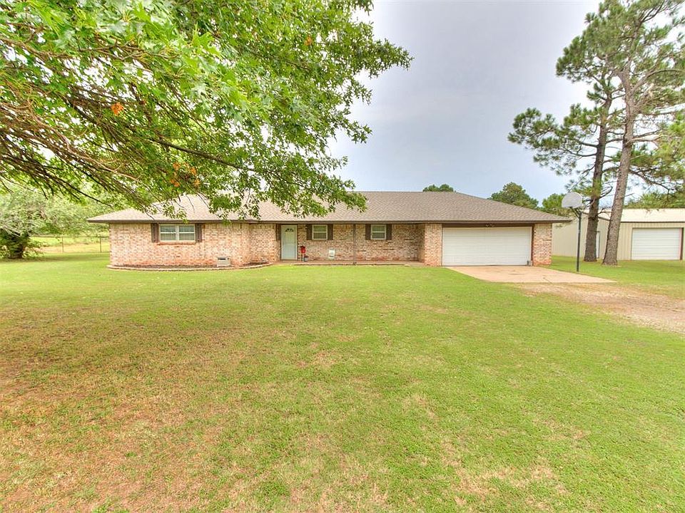 Back on the market at no fault of seller, no inspections were completed by buyer. Looking to escape to the country? This charming home sits on a picturesque 1.85 acres just a little over 2 miles from downtown Tuttle. This beautiful property is surrounded by mature, gorgeous trees, offering peace and privacy at the end of a cul-de-sac. Featuring 3 bedrooms and 2 bathrooms, along with an oversized 2-car garage, the home is ready for you to make it your own. No HOA. So if you want horses, chickens... livestock is welcome! From the large covered porch, step inside to a spacious, bright living area filled with natural light. The open-concept dining, kitchen and living areas are perfect for entertaining. Additional features include newer ceiling fans throughout, wood detailing, and a cozy wood burning brick fireplace. Enjoy privacy with trees lining the fenced back yard. The property also includes a newer roof, installed in 2024, 30 x 40 shop with electricity and concrete flooring, a large walk-in storm shelter right outside the back door, a lean-to, storage building, city water, septic system, and a cozy wood-burning fireplace. Property qualifies for no down payment USDA financing!