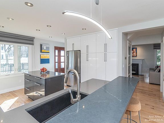 Located on a large wooded lot in the Burns Park school district, this recently renovated home is custom-designed for comfortable modern living. New picture frame windows throughout the house create a bright and warm atmosphere, while hardwood flooring and modern finishes add to the beauty and welcoming quality of this home. The chef's kitchen features solid wood, soft close cabinets with large pantries for plenty of storage space. New stainless steel appliances, quartz countertops and a free standing bar make this kitchen a favorite hangout spot for guests and family. Designed to create an indoor-outdoor experience, outswing French doors lead from the kitchen into a private backyard featuring a large patio, and enclosed by a new cedar fence. Upstairs, the elegant and spacious master suite features a custom walk-in closet and a spa-inspired bathroom with relaxing aesthetic and amenities. The second bedroom is light filled, spacious and cozy. The finished lower level contains a spacious and light filled third bedroom / flex space. The basement laundry room features plenty of hardwood counters and surface space and recently resurfaced epoxy floors. The home is walking distance to the Big House, Burns Park, Trader Joe's, Whole Foods.