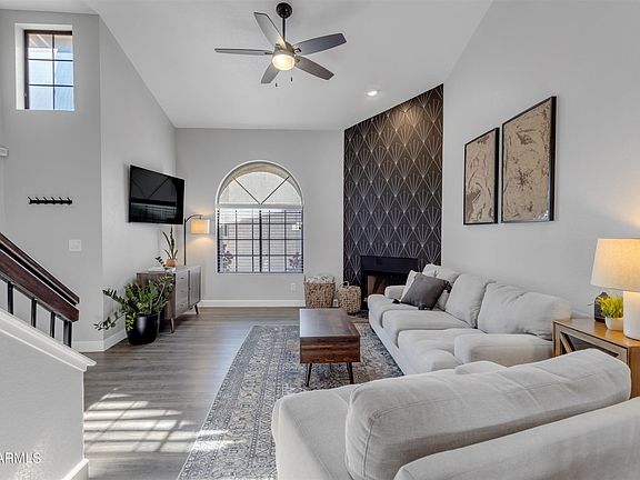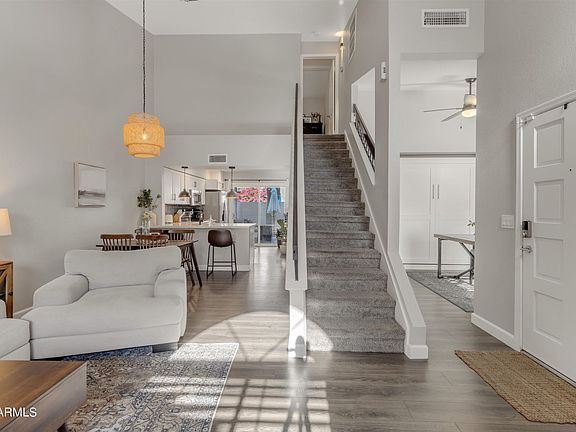 Come tour this beautiful townhome in an amazing community! Walk through the front door to vaulted ceilings and an open concept living room/dining room and den. This townhome offers 2 masters bedroom/bathrooms, 1 upstairs and 1 downstairs, with an additional powder bathroom downstairs for guests. The den has a custom built-in murphy bed. The kitchen features quartz counter tops, modern backsplash, stainless steel appliances, a reverse osmosis system and soft close cabinets. The bathrooms, flooring and fireplace are all beautifully updated. New washer and dryer are located inside the unit, a large storage closet on the back patio and 2 assigned covered parking spots right out front. The unit is immaculate, modern and move-in ready!