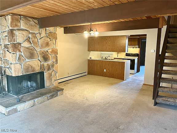 Welcome Real Estate Buyers to Treetop Trail in Akron! This Two Bedroom, Two Bath Unit is Available Now! Breathtaking Views All Year Long! Master Bedroom / Den leads to the Balcony Overlooking the Valley! Single Car Garage is Near the Front Entrance! Top Floor Bedroom has Vaulted Ceilings and Original Woodwork throughout. Gorgeous Fireplace in the Spacious Living Room. Appliances (Stove, Dishwasher, Refrigerator, Top/Down Washer and Dryer, and Wall Unit A/C) Included! Occupants only pay for Electric and Cable/Internet hook-up. Water, Trash, Heat and Pool Access are all covered by the Home Owners Association! Long Term Ownership and Professionally Managed for Years! Enjoy Home Ownership or a Solid Income Producing Property for a Fraction of Today's Prices! Call Today!