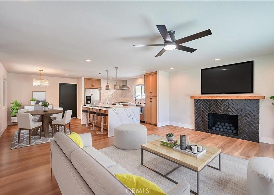 Beautiful single level home completely remodeled. Well-manicured lawn, front porch and Majestic Palm trees welcome you! This meticulously remodeled residence features 3 bedrooms and 2 bathrooms. The open concept living space boasts luxury vinyl plank flooring, and seamless transitions between living, dining, and kitchen areas.