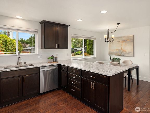 Beautifully remodeled rambler on a level .36-acre corner lot in a quiet, friendly neighborhood! This move-in-ready home features a stunning kitchen with quartz counters, stainless appliances, and new cabinets. Upgrades include all-new flooring, windows, interior/exterior paint, doors, blinds, and a new furnace and heat pump (2021). The oversized deck is perfect for entertaining, overlooking a fully fenced backyard. Blocks from Watershed Park with miles of hiking trails and nature, and just minutes to downtown Puyallup—peaceful, convenient, and full of charm!