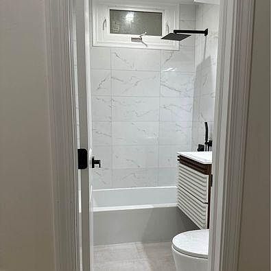 A sleek bathroom equipped with contemporary fittings and an alcove bathtub, complemented by chic, marble-patterned tiles that create a tranquil environment for unwinding.