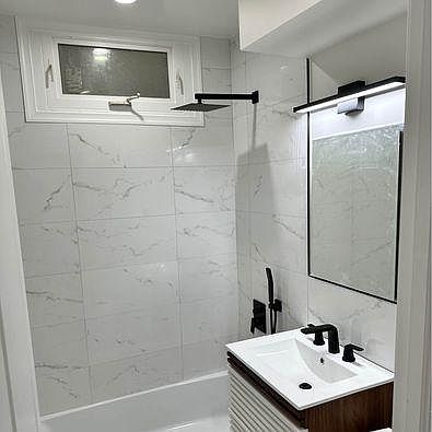 Modern renovationAmple street parkingChic marble-patterned tilesIn-unit washer and dryerNew easy-care flooringFully updated kitchenFresh paint