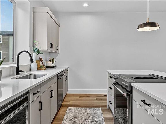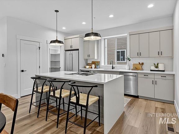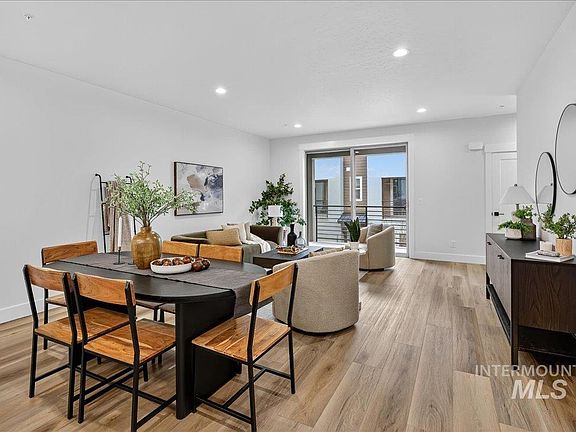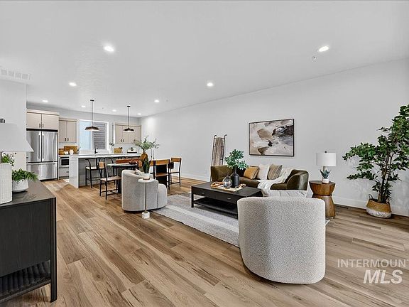 Where thoughtful design meets low-maintenance living. This end-unit residence offers a rare new-construction opportunity in the heart of the Boise Bench, just minutes from Boise State University, Micron and Downtown. Natural light fills every level, complementing an upgraded interior with three private bedrooms each featuring a dedicated en-suite bath. The airy main level blends high ceilings with refined selections, including sleek LVP flooring, custom cabinetry and designer-curated finishes. A waterfall-edge quartz island anchors the gourmet kitchen, complete with a premium KitchenAid® appliance package (refrigerator included) and a walk-in pantry, all opening to the great room and patio beyond. The lower-level suite offers exceptional privacy, perfect for a dedicated home based office or business, studio, or guest retreat. A full two-car garage provides dedicated parking and additional storage. Perfect as a lock-and-leave home, long-term hold, or flexible investment. Midtown Heights is a collection of 35 newly built residences by Tresidio Homes, a respected local builder recognized for quality craftsmanship. Exterior maintenance and landscaping are professionally managed through the HOA for simplified living.