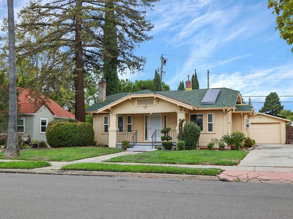 Near Victory Park and The Haggin Museum! Built in 1929, this adorable home with so much original character also features dual-pane windows, an updated kitchen with raised panel cabinetry, granite countertops, stainless steel appliances, island with eating bar, ample countertop space to prepare meals, lots of pantry cabinets and even a built-in desk area. There are French doors to separate the kitchen from the formal dining room. Imagine relaxing evenings in the living room, where the fireplace creates a warm and inviting ambiance. The two bedrooms and bath area can be separated by the door at living room/hallway for peaceful sleep. Wood floors in dining, living, hall and bedrooms too! The screened-in porch at rear yard covers the opening to the partial basement, and the laundry is located in the garage with additional cabinets for storage. There's more! A studio behind the garage for extra space...maybe an art studio, music studio, office, or hobby room! Spacious backyard with lots of fruit trees and room to plant your own garden. Need a long driveway? It's here! The home has leased solar too! So much to see!