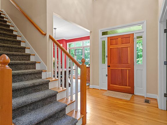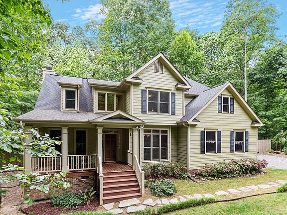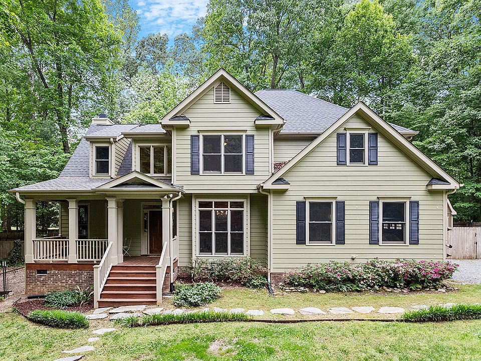 Welcome to your private oasis, just minutes from Chapel Hill! This lovely home, built by Gail Crabtree, sits on more than an acre and welcomes you with a gracious front porch. When you enter, notice the lofty ceilings, the site-finished hardwoods, and the natural light streaming in from the oversized windows. The kitchen has a large island and opens to the family room with cathedral-ceiling and gas log fireplace. The first floor includes an office with French doors, which could double as guest space for visiting friends and family, as well as a full bath. Upstairs there is a large primary suite with walk-in closet, step-in shower and garden tub, as well as 2 additional bedrooms and a bath with a double vanity. The backyard is fully fenced with an expanded deck that is hot-tub ready (wiring in place). Bring your chickens and your gardening gloves - lots of room for both! Plenty of storage with 2 pantries, huge laundry room, 2-car garage, walk-in storage, and a shed. Less than 2 miles from I-40/I-85 exit 160 with low Orange County taxes.