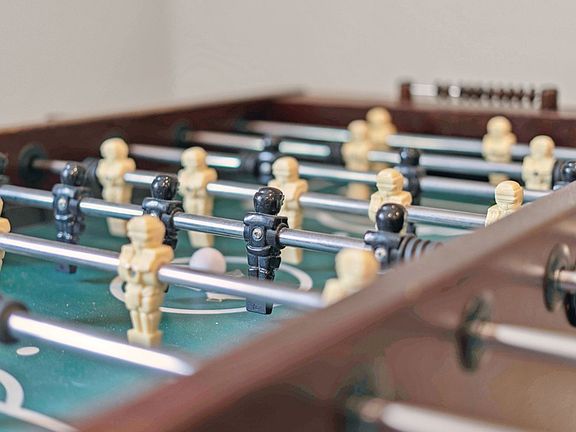 Garage converted to entertainment space (air hockey, foosball, shuffleboard and seating)