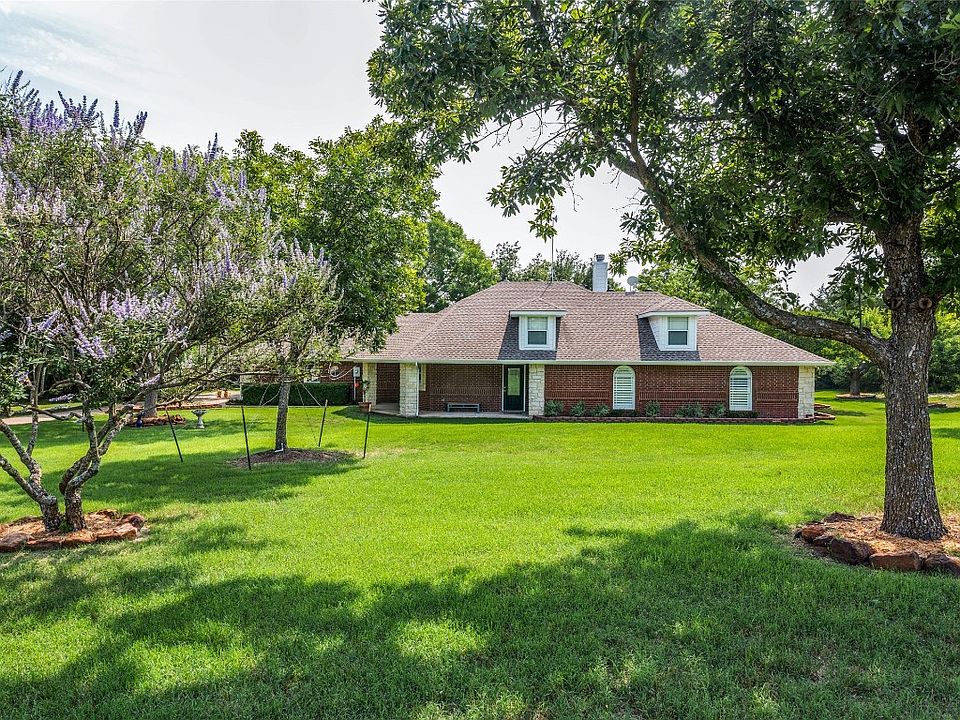 Enjoy relaxing sound of the waterfall as you sit by the brook in this beautiful updated home sitting on private 2.69 acres with lots of LRG mature trees (pecans, crape myrtles, Chinese Pistachio, etc.) 5 miles from I-35 yet country style of living. Features in-wall vac system, finished out over-sized fully insulated garage expoxy flooring, LRG roof-covered flagstone patio and sidewalk, luxury vinyl plank flooring in 2 living areas (1 with wet bar and wall of windows) kitchen, laundry, baths. Scraped hardwood flooring in BDRMS & custom plantation shutters throughout. Updates in 2020 include New HVAC, duct work, spray foam attic insulation including garage, stone WB FP, modern in-wall electric FP, 5 burner stovetop, crown molding, tall baseboards, ceiling fans, irrigation control system, cabinet updates. Lrg raised veg garden near back of property. W-D, refrig, TV's convey with right offer. Extra 320 sq.ft. 8FT x 40FT metal storage container. ASK your AGENT to pull FEATURES in MLS docs.
