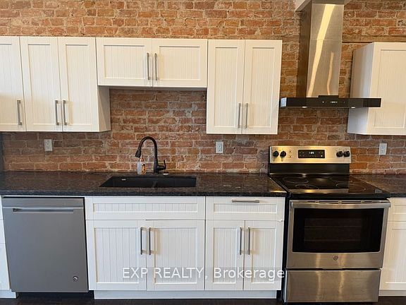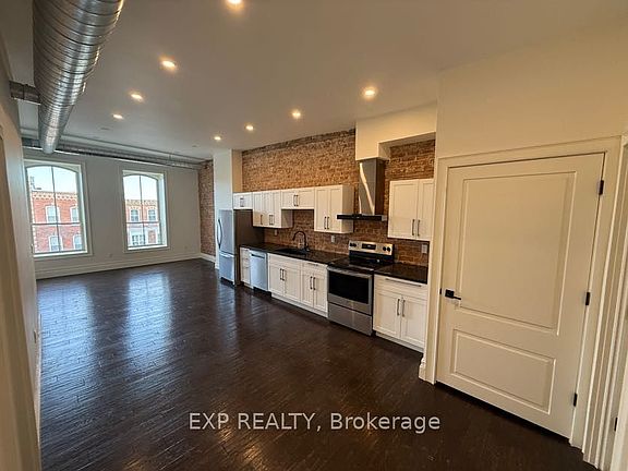Exposed brick wallsSoaring vaulted ceilingsOpen-concept layoutNatural lightHigh end kitchenGranite countersStainless steel appliances