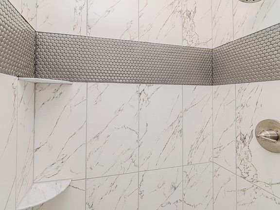 Stylish kitchen backsplashTop tier finishesTiled master shower