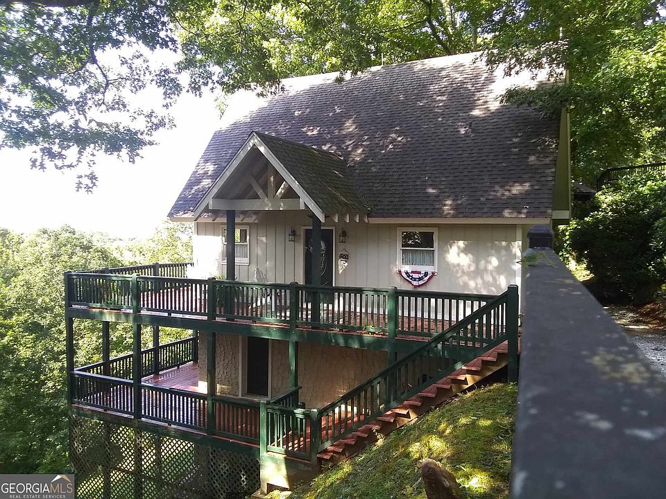 The most adorable, all wood, cabin with a magnificent view in Sky Valley, GA. The home has 3 bedrooms, 2.5 bathrooms, and a den with half bath on lower level. Each level has a deck to take in the view facing Sky Valley Golf Course and the beautiful mountains. You will feel like you stepped into a Southern Living Magazine home when you walk into this sweet home with a rock fireplace and all wood floors and walls on main level. Country kitchen and a dining area. Plenty of closets. No HOA required but you can join the SV Golf Club with different types of membership fees. Would be a great vacation rental or full-time home. Only 20 minutes to Highlands, NC and Clayton, GA