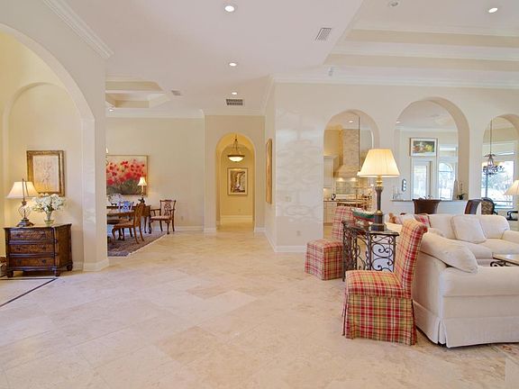 Exquisite home on an equally impressive water to golf view lot. Travertine floors throughout, 12' ceilings & walls of glass to bring the views in maximize this homes appealing wide open floor plan. The heart of the home is the spacious Gathering Room which is open to the Kitchen & has a wall of disappearing sliders that open to the huge screened Lanai & Pool area - this home lends itself to entertaining. The fabulous Kitchen has an abundance of beautiful cabinetry, gorgeous granite, center island & top of the line ss appliances. An adjacent Butlers Pantry with wine chiller facilitates entertaining. Off the Gathering Room is a beautiful Home Office with built-in desk & coffered ceiling.The luxurious Owners Suite is sure to please. 2 Guest Suites round out the 1st level with Bonus/4th BR up