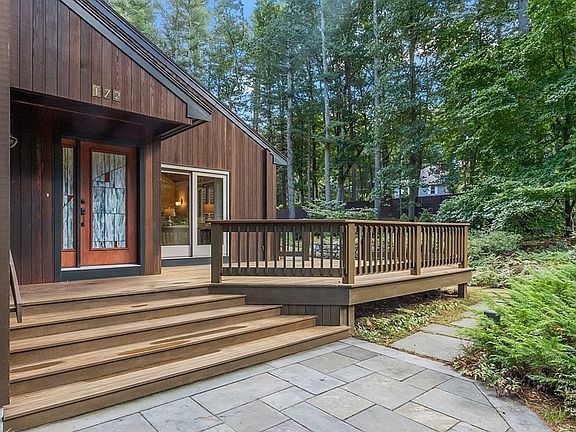 Located on a cul de sac near hiking trails and directly adjacent to conservation land, this Carlisle contemporary home has access to the best parts of town while offering privacy in a neighborhood setting. A state of the art Riverflow indoor pool can be enjoyed with an ensuite bathroom featuring a steam shower, making this a one-of-a-kind property. Upon entering the first floor, the two-story great room welcomes you with skylites, access to one of two decks and a fireplace. The renovated kitchen is open to the family room offering single-level living with a first floor bedroom and renovated full bath. Two more bedrooms, a renovated full bath, and an office area complete the second level. There is substantial room for an exercise, playroom or 2nd home office with exterior access in the lower level, which also features ample storage area and laundry. Outbuildings include a garden shed and oversized storage space for the car collector! 4-bedroom septic allows for expansion possibilities.