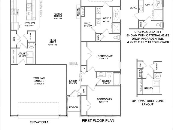 The Duncan is an open layout ranch with three bedrooms and two baths. Main floor living areas include a flex area open to the entry and a large family room with optional fireplace. The flex area can serve as additional dining space, sitting area, home office or study area. A covered patio is situated just off the family room, extending outdoor living space. The kitchen is open to the family room and includes a breakfast area, pantry, utility room with a folding area, and pass-through to garage. A drop zone layout is available, including coat closet and pantry. The primary bedroom suite has a trey ceiling in the bedroom, a 4' shower, linen storage, double vanity, and a large walk-in closet for shared use. Bedrooms 2 and 3 are located off a semiprivate hallway with linen storage and close to Bath 2.