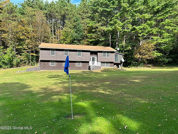 Attractive ranch home located on a quiet country road. This home features large rooms and an open floor plan, a sun porch, two good-size full baths, and plenty of light. LR has a propane stove. The basement has a garage, and a third BR just waiting to be finished. Cooling is via 2 mini-splits. The Generac generator is large enough to run the whole house.. The property also has a unique 3-hole chipping course with regulation cups and pins. Closest tee is 46 yards, and longest is 76 yards with 3 different tee locations per hole. Flat in-ground stones show distances.