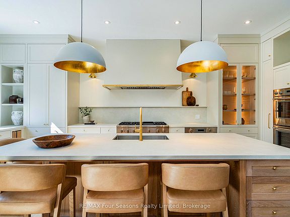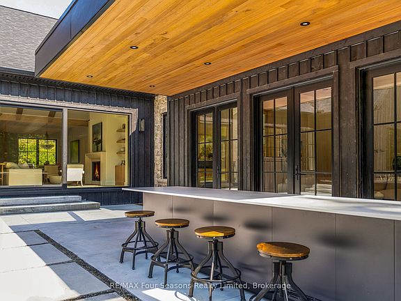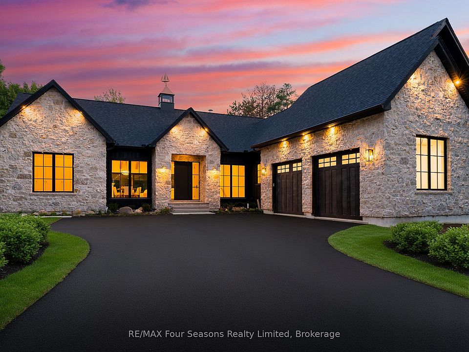LUXURY DESIGN BUILD NEAR CRAIGLEITH AND ALPINE: This custom-built masterpiece by Coastal Impressions blends timeless European architecture with modern luxury, offering 5,589 finished sq ft (3,546 AG + 2,043 BG) on a beautifully landscaped 80 x 192 lot. The exterior showcases board and batten with hand-laid stonework reminiscent of old-world craftsmanship, while the interior features engineered white oak flooring, soaring 10' and 12' ceilings with vaulted areas up to 18', and graceful barreled archways. The gourmet kitchen, open to a warm family room with a large gas fireplace and a separate dining area, is highlighted by a custom white oak island with quartz countertops, bar seating, and top-tier Thermador Professional appliances, including a 7-burner gas stove, dual wall ovens, refrigerator and freezer towers, dishwasher, and speed oven/microwave. Two 30" Franke sinks and a hidden cupboard door leading to a back hallway with pantry and office add both charm and function. Beyond a small bar area, double white oak doors open to the dramatic après-ski lounge featuring a stunning custom stone wall, a wood-burning Rumford fireplace, and three sets of double doors leading to the outdoor living space. The main floor offers three bedrooms, each with ensuite, plus a powder room. The main-level primary suite is a true retreat with vaulted ceilings, a spa-like ensuite, and a large walk-in closet. The lower level is designed for leisure with a large built-in bar and island, gym with rubber flooring, a spacious gas fireplace, two bedrooms, and a four-piece bath. Outdoor living shines with 1,000 sq ft of space, including a custom kitchen with built-in BBQ, surrounded by 36 trees and eight perennial gardens. Additional features include heated floors in the primary ensuite and lower bath, a 22kW Generac generator, and a two-car garage. Walkable to Craigleith and Alpine ski lifts, this home defines refined four-season living in The Blue Mountains.