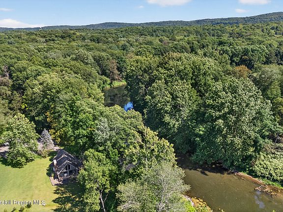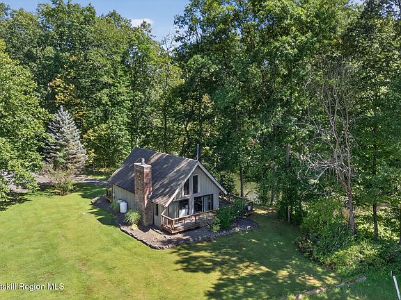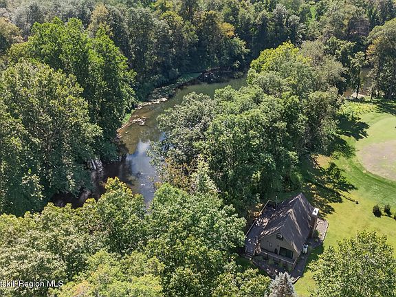 Waterfront and on a golf course! Just 90 minutes from Metro NY, this two-bedroom chalet style home with 2.3 acres and expansive frontage on the Rondout Creek is also sited on the 7th green and at the end of a cul-de-sac. The wrap around deck allows for seasonal dining and enjoyment of the outdoors, including sunsets and the lovely creek. The great room includes a generous sized living room and dining area with floor to ceiling windows, vaulted ceiling and stone fireplace with propane stove insert. Smartly designed kitchen with new quartz countertops and sink, ample cabinets and pantry. Truly a bird watcher's paradise, there is a view from almost every window - either the creek for wildlife or the bright green golf course! Any anglers in your group? Bring your fishing pole to take advantage of the direct Rondout Creek frontage and hook a nice small mouth bass. The main floor bedroom is well-sized with two closets and adjacent full bath. The second story sleeping loft also has a vaulted ceiling and is open to the common space. The 14X8 storage shed is great for your belongings and two kayaks are included in the sale! Take advantage of this rare opportunity to make your own memories in a home that is ready for a new chapter, having been cherished by the same family for decades. So well located - just two minutes to High Falls for Ollie's Pizza, Blue Heron Books and vintage shopping. Ten minutes to Mohonk Preserve's Spring Farm Trailhead, 20 minutes to Kingston and New Paltz for easy access to the NYS Thruway and all the area has to offer. Enjoy our local venues such as Innes for world class dining and spa, Arrowood for local cider and spirits, Kelder's Farm to pick fresh produce and join the Stone Dock Golf Course for a great nine holes of golf. For either full or part time use, this location and house is a true gem.