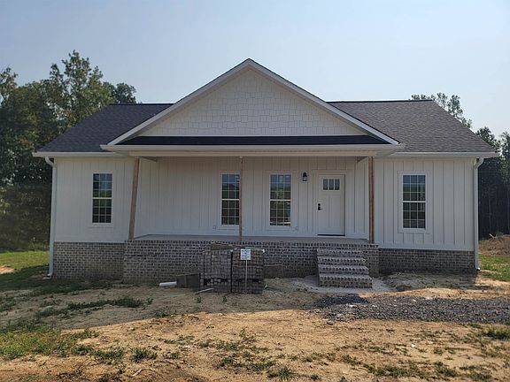 New under-construction home offering 3 bedrooms and 2 bathrooms with an open, split floor plan. Exterior features include hardy board and batten siding, brick foundation, covered front porch, back deck, and concrete driveway with sidewalk. Interior highlights include custom cabinetry, Calcutta quartz countertops, 3/4 inch hardwood flooring, tile flooring, recessed lighting, and custom tile work in the kitchen, baths, and laundry room. The primary suite features an oversized step-in tile shower, double vanity, and walk-in closet.