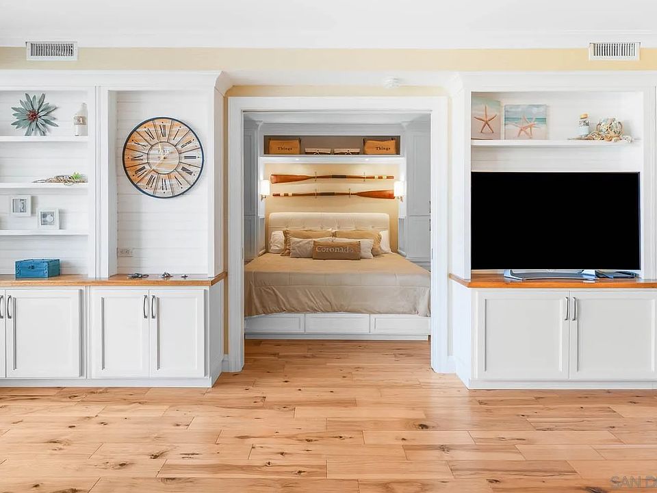 Located just minutes from the sand, this turnkey, fully furnished studio in coveted La Sierra Tower features a fresh, beach aesthetic. is beautifully Renovated by Clark Construction, enjoy breathtaking views of the Hotel Del Coronado with thoughtful upgrades that include new windows, wood floors, crown molding, and custom built-ins throughout, offering both beauty and function. The kitchen is a standout with high-end Bosch and Viking appliances, custom cabinetry, and a breakfast bar. A spacious walk-in closet, dining nook, and elegant bath with walk-in shower round out this coastal retreat. Move right in and start experiencing The Shores lifestyle!