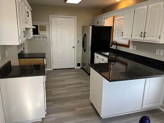 Nice family home. Updated with granite countertops, stainless appliances (dishwasher, side-by-side refrigerator with ice/water in door), range, sit-at bar. Cathedral ceiling in living room. Laundry room with w/d hookups. Tile shower. Laminate flooring throughout. 3 bedrooms, 2 baths, 2-car garage. Pet friendly, fenced yard. deek & concrete psver patios in rear. Storm shelter in garage.