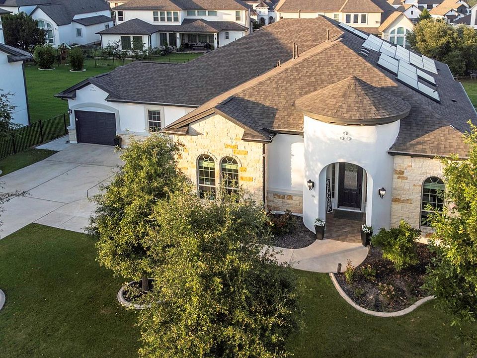 Experience Luxury Living in Travisso! Step into elegance with this beautifully designed home, perfectly situated on a quiet cul-de-sac in one of Leander’s most desirable communities. From the moment you enter, you’ll be captivated by the open floor plan, rich hardwood floors, and a chef’s dream kitchen complete with high-end finishes and abundant space for entertaining. Featuring 4 spacious bedrooms, 3 full baths, 2 dining areas, and a large family room, this home offers both comfort and sophistication. Movie lovers will adore the private theater room with full surround sound—perfect for cozy nights in. Relax in the spa-inspired primary suite with a walk-in shower, soaking tub, and double vanities, or step outside to your oversized backyard retreat with a covered patio and a full outdoor kitchen—ideal for weekend gatherings and serene evenings. Enjoy eco-friendly living with Tesla solar panels, EV chargers, and a 3-car garage, all on nearly half an acre offering exceptional privacy. Travisso residents also enjoy resort-style amenities, including a clubhouse, pool, fitness center, trails, and breathtaking hill country views. This property delivers the ultimate in luxury, comfort, and convenience!